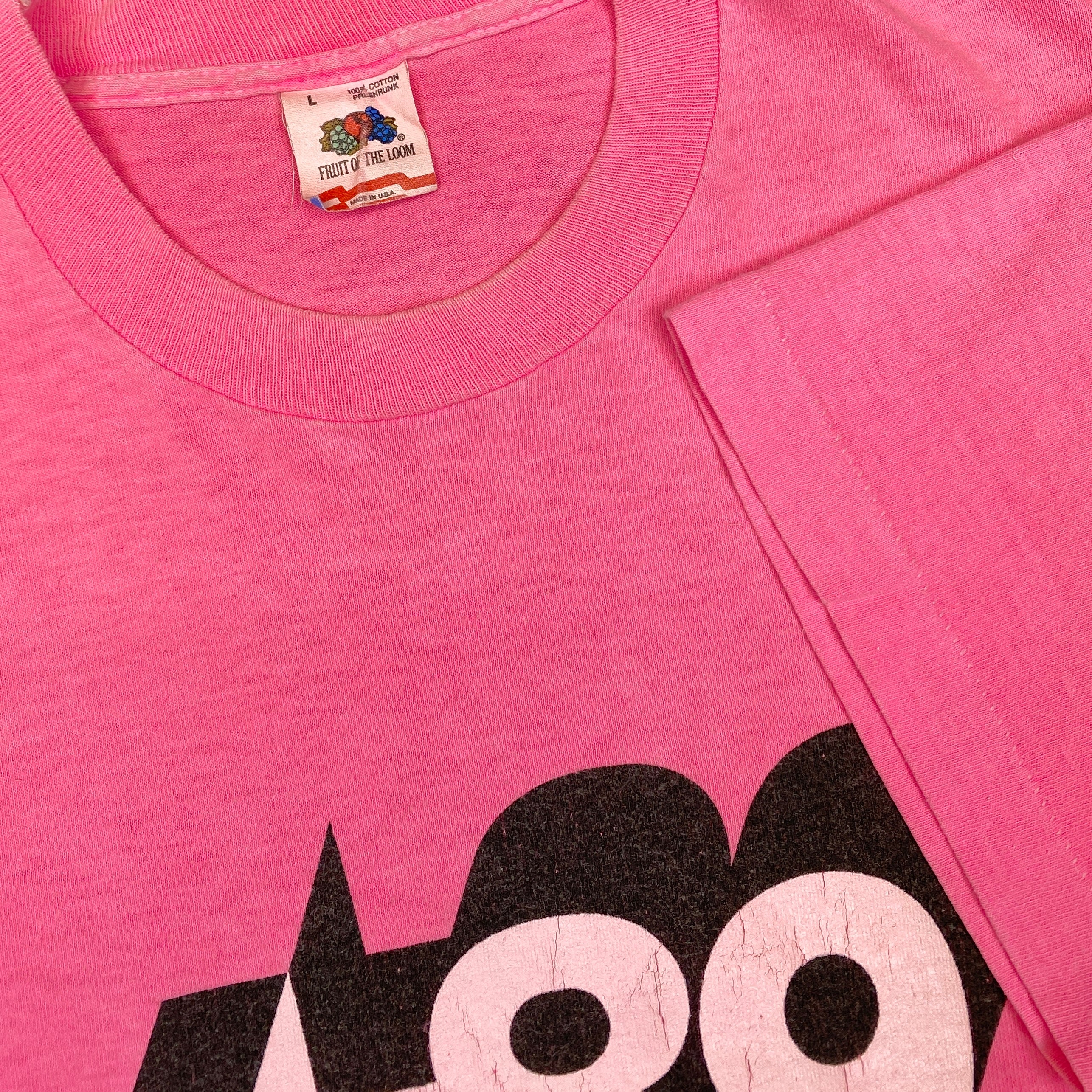 REAL NICE NEW ORDER SHIRT FROM THEIR 1989 US TOUR. SIMPLE FRONT PRINT AND TOUR DATES BACK PRINT. DIY DYED PINK ON SINGLE STITCH FRUIT OF THE LOOM. TAGGED AS L FITS TRUE TO SIZE.