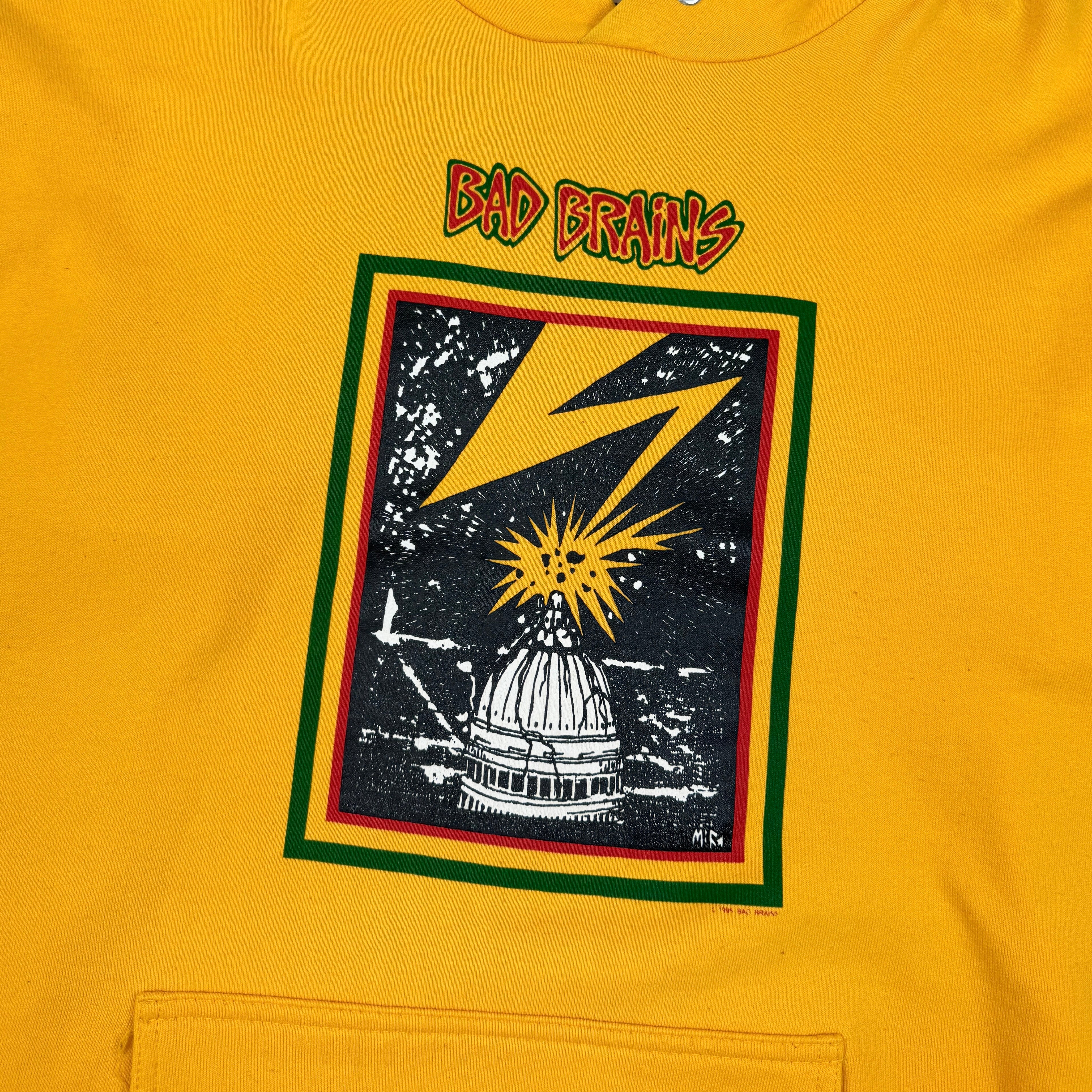 Super good Bad Brains hoodie from 1995. Japan event exclusive with full colour logotype and album graphic on the front and event detail on the back in red on a vibrant yellow 50/50 poly-cotton blend United Sports tagged hoodie.