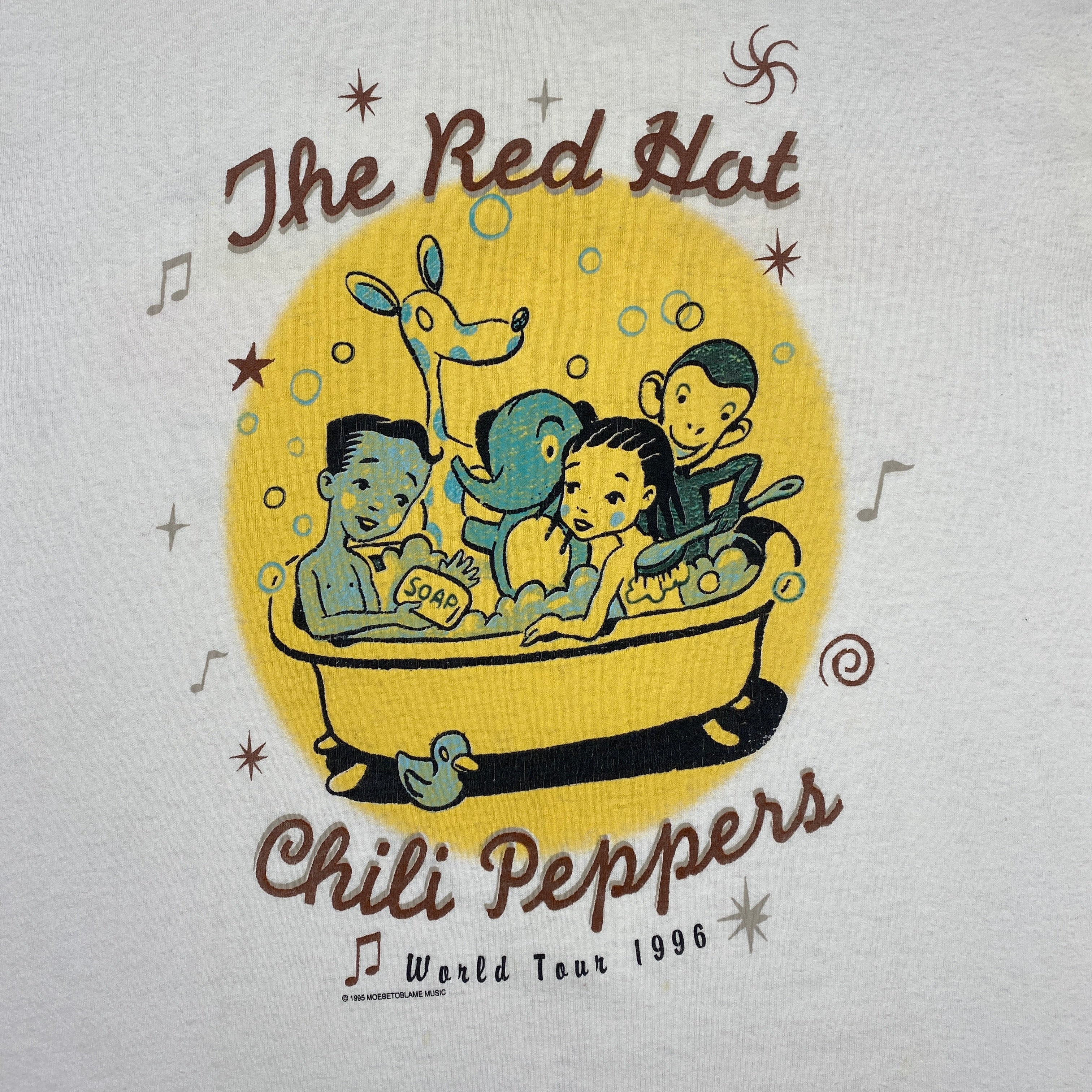 Super good Red Hot Cilli Peppers T-shirt from 1996 and a world tour following One Hot Minute album release. Really good bath scene American advert graphic front print and logotype back print on a white single stitch Screen Stars T-shirt. Tagged XL fits true.