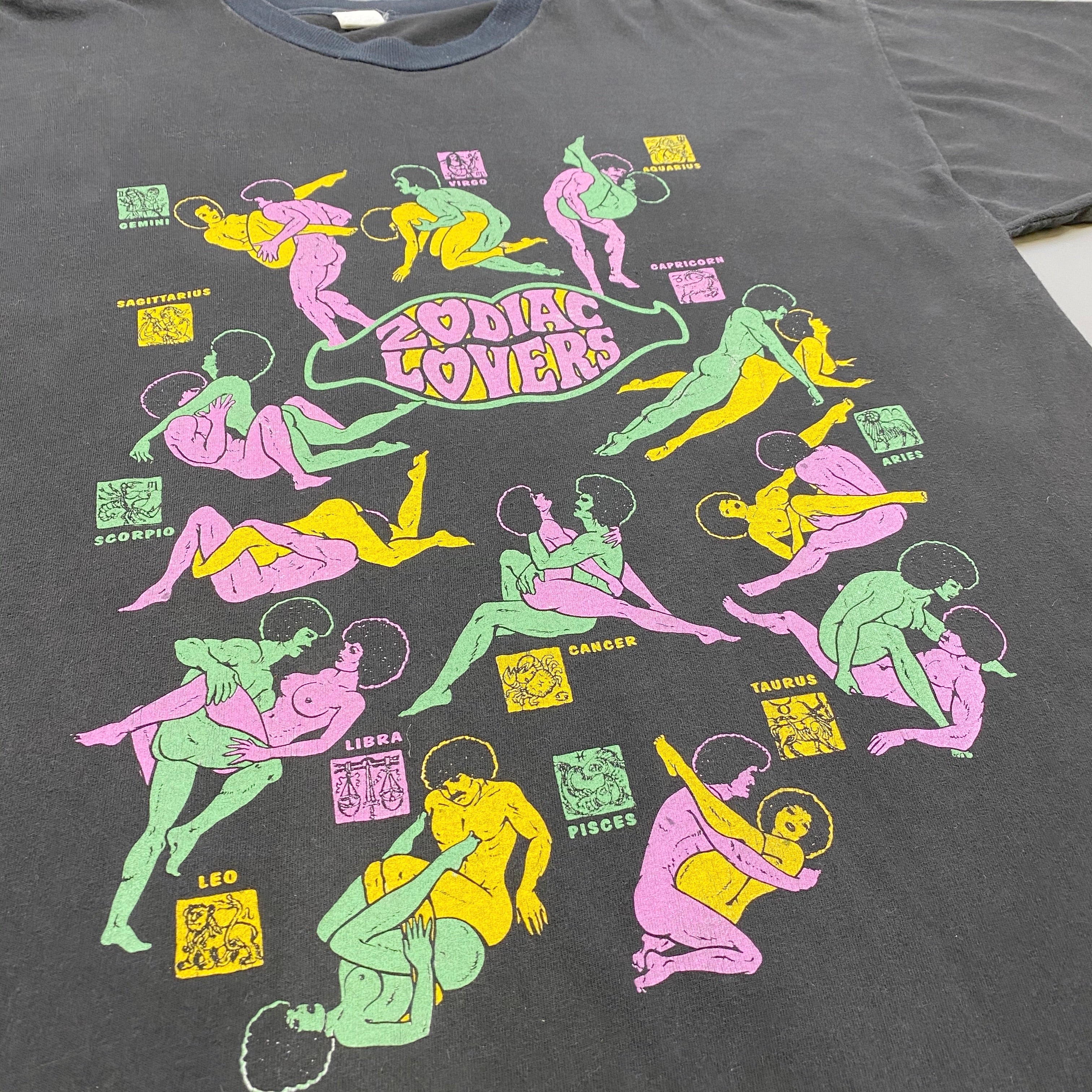 Crazy good tee from the early 90s with sick full colour front and back print depicting different sexual positions in relation to zodiac signs. 100% cotton single stitch tee with real good wear and fade.